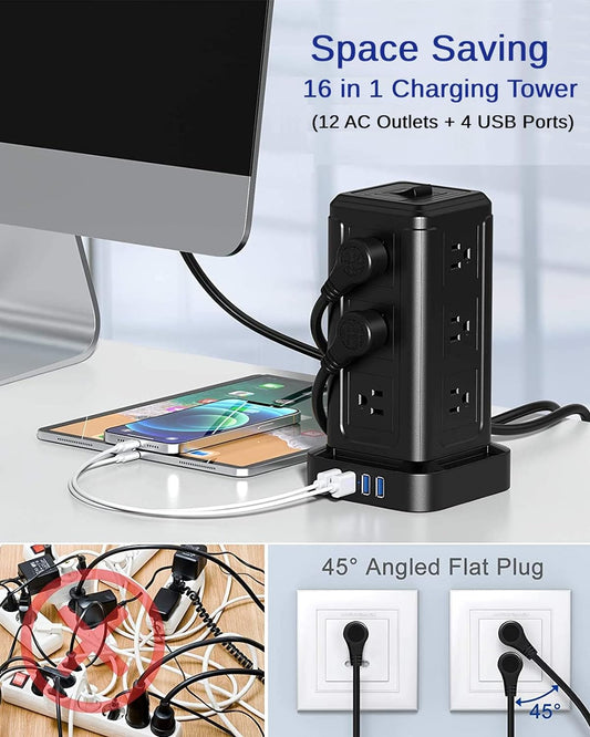 Surge Protector Power Strip Tower with 12 Outlets 4 USB Ports, 10Ft Long Extension Cord Power Strips Desk Powerstrip Charging Tower, Overload Protection Fire Proof for Home Office Dorm-Black